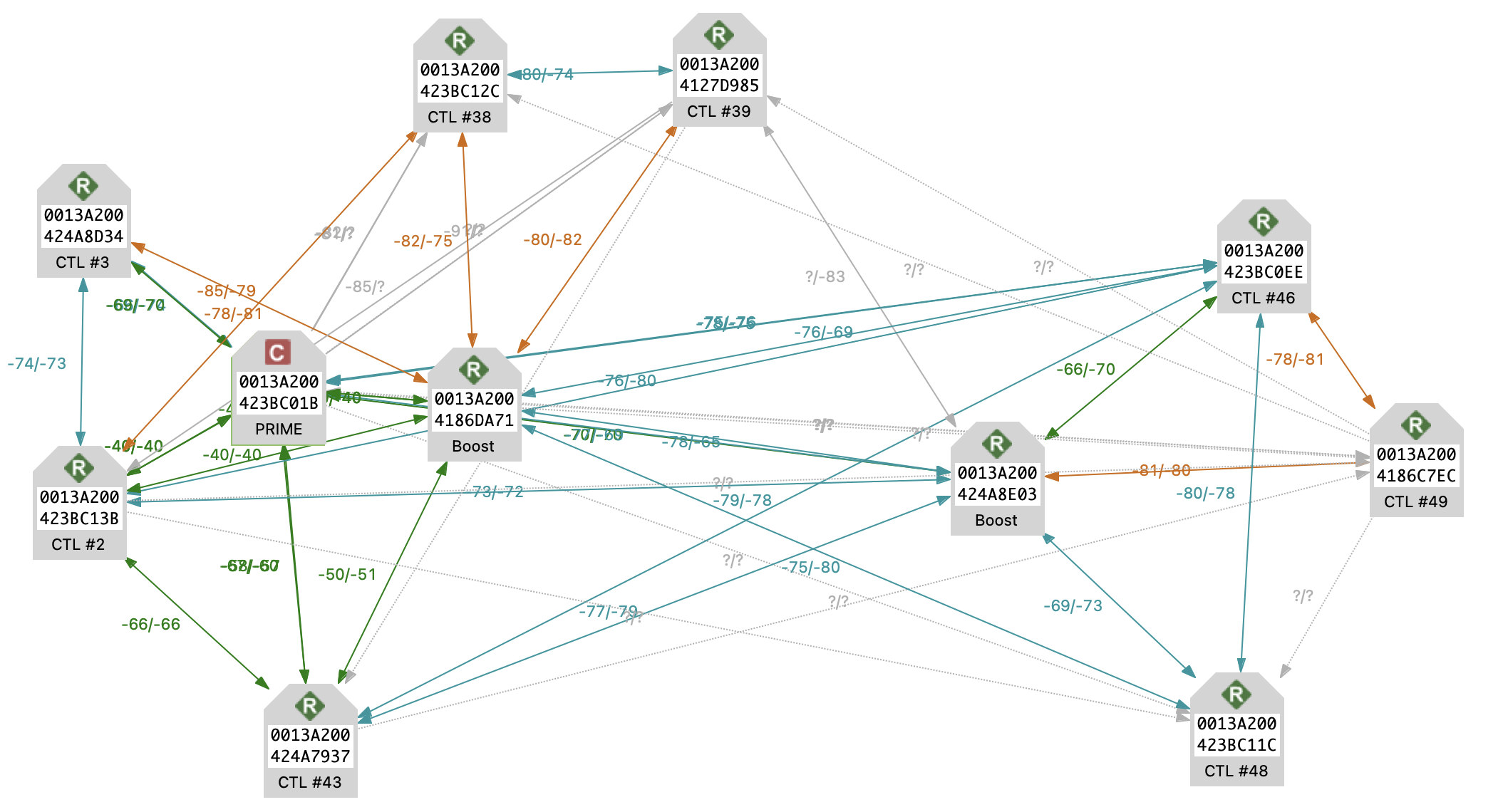 meshO radio controls communicate with each other forming a mesh network. Each control acts as a repeater for other controls, so the information can hop through multiple nodes to find its way back to the meshO Prime connected to the event computer.