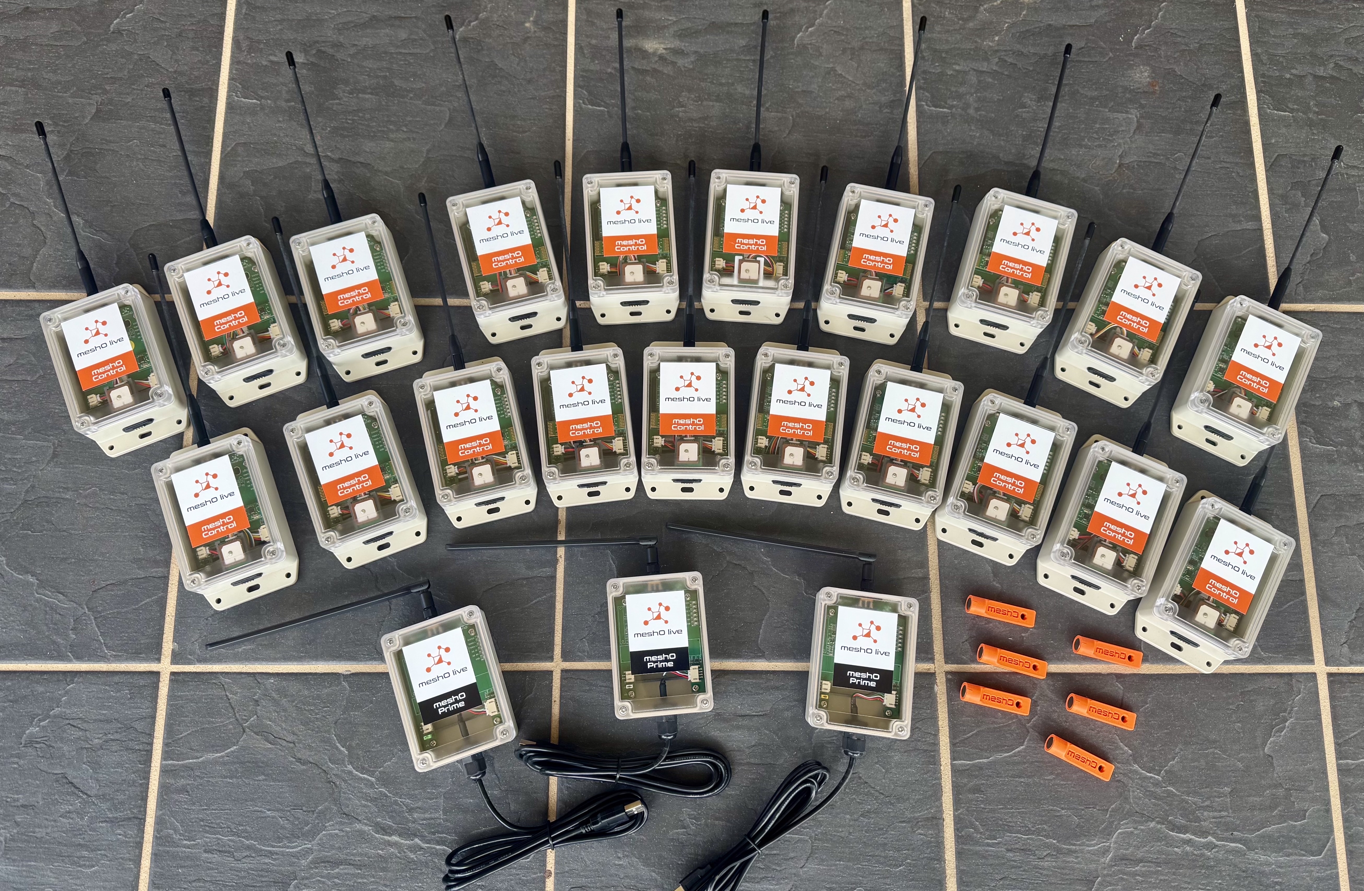 meshO radio controls communicate with each other forming a mesh network. Each control acts as a repeater for other controls, so the information can hop through multiple nodes to find its way back to the meshO Prime connected to the event computer.