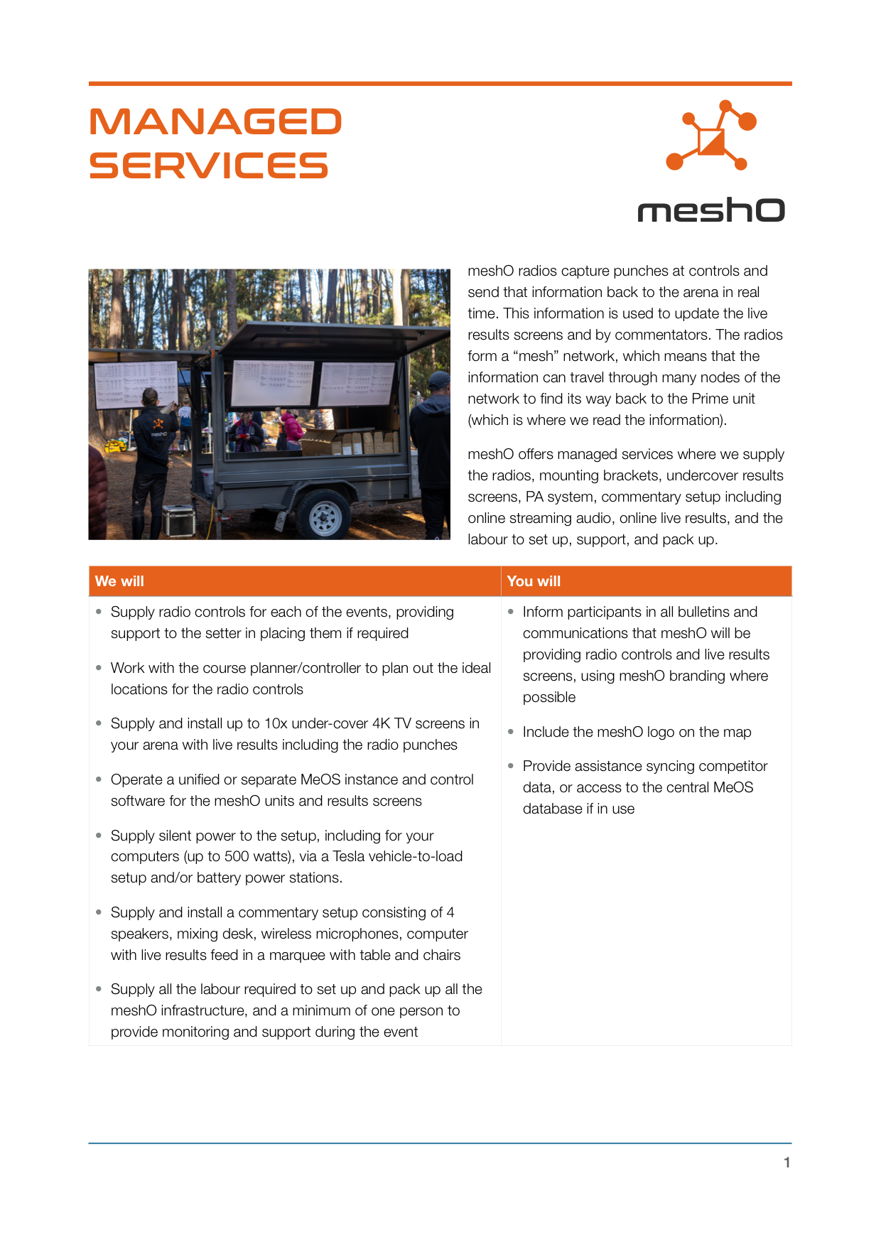 - Inform participants in all bulletins and communications that meshO will be providing radio controls and live results screens, using meshO branding where possible